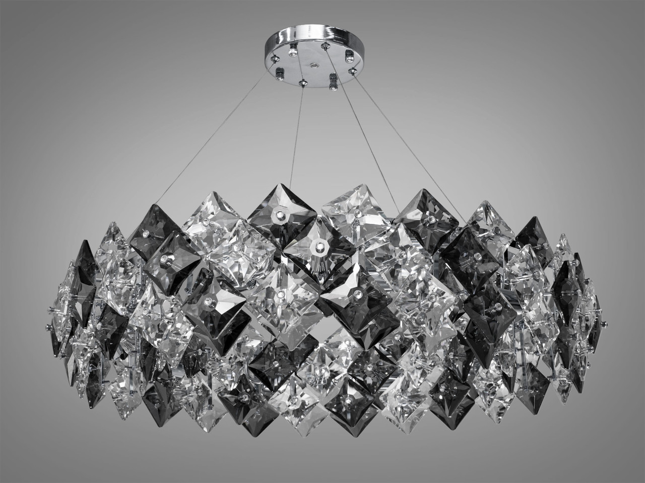 Виконана в хромованому кольорі, вона оснащена десятьма лампами Е14, які забезпечують яскраве та рівномірне освітлення. Її зовнішній вигляд підкреслюється квадратними кристалами, що створюють вишукану гру світла, додаючи простору динаміки та глибини.